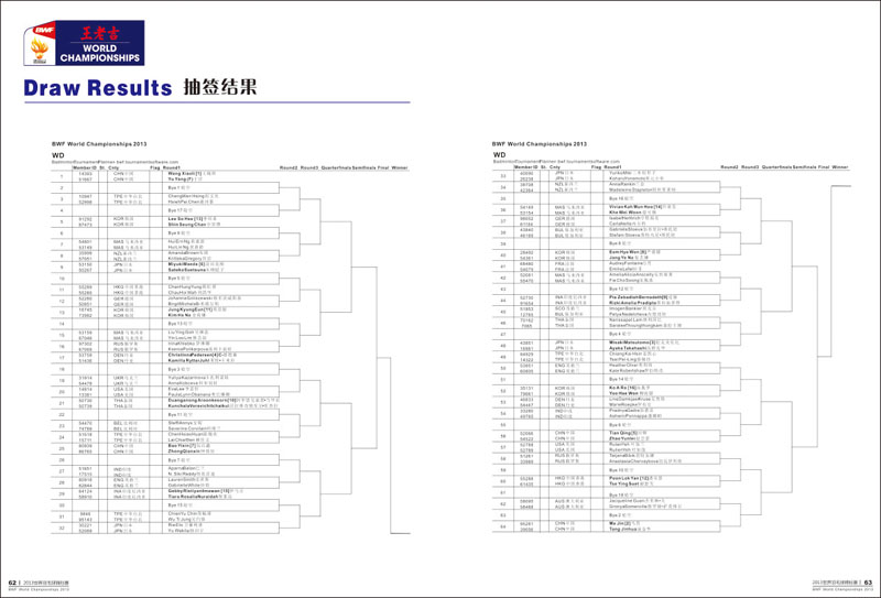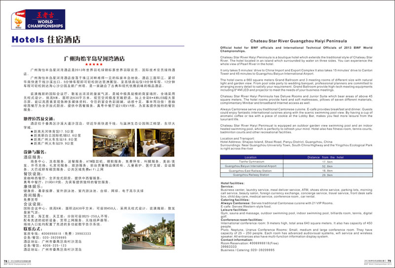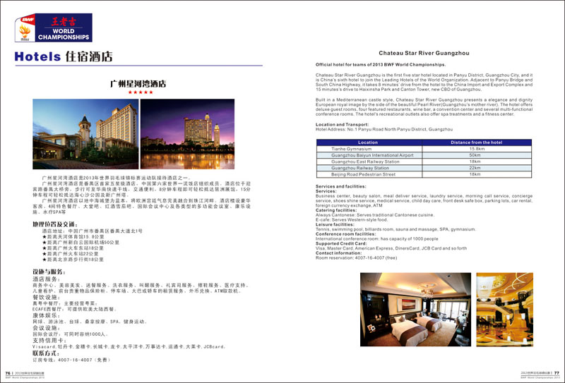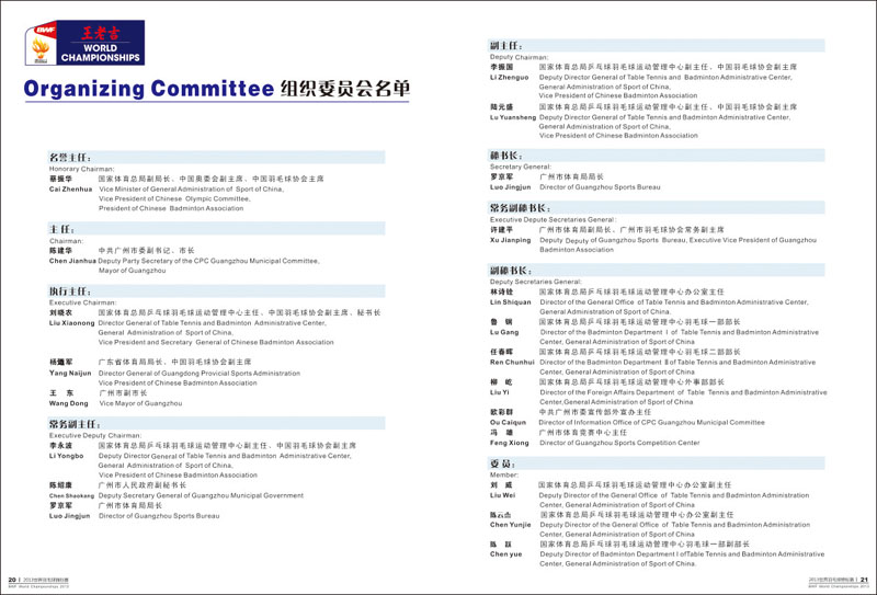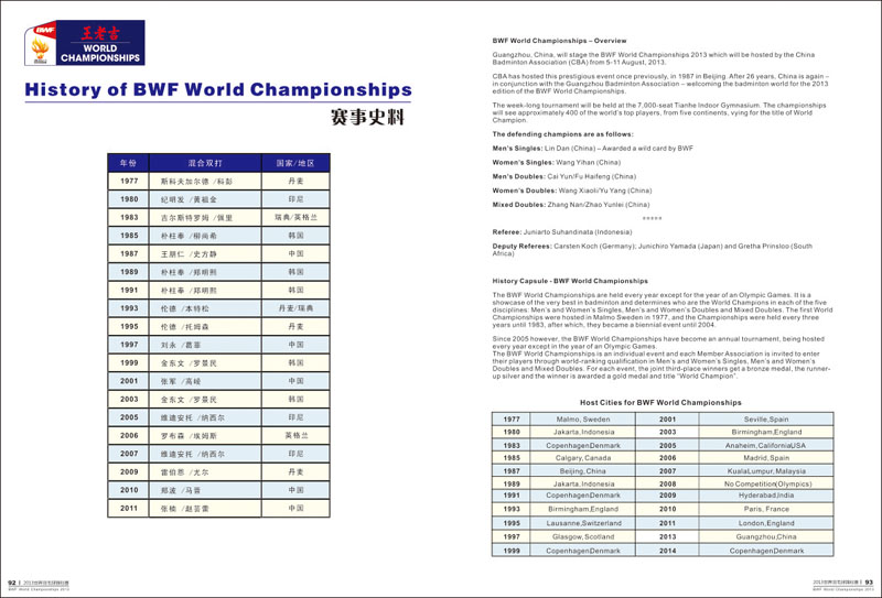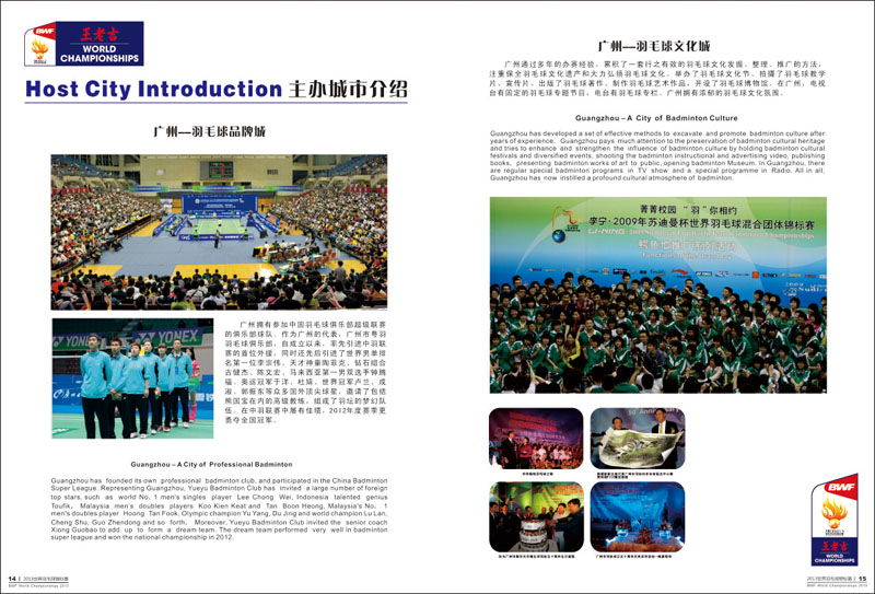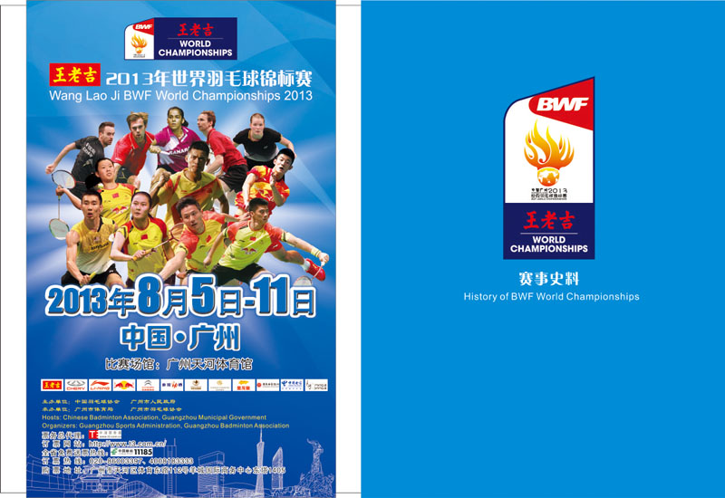 2013年羽毛球世锦赛于8月5日至11日在广州天河体育馆举行,届时来自48个国家和地区共337名运动员参赛。世界羽毛球锦标赛在广州举行,使广州成为举办世界羽联所有顶级赛事的“大满贯”城市。 广州野马广告有限公司担任赛事的秩序册、媒体指南、成绩册、获奖证书等设计制作 。