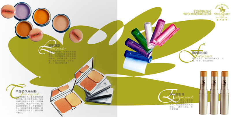 这是一本香港公司彩妆产品的宣传手册。设计中大胆用色,突出彩妆特点。大量使用图形色块和产品照片想融合,以达到色彩斑斓的效果。