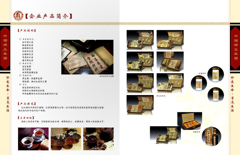 这是一本保健品行业集团公司的宣传册,设计中运用了一些中国传统图形元素,和产品包装、企业发展思路相配合。提出“珍爱生命,享受生活”的理念。